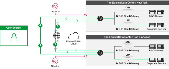 F5 DNS also supports business continuity with the ability to move responsibility for answering DNS queries to alternate instances in the same data center or in another region, thereby foiling attempts to disrupt business by overwhelming critical infrastructure. By leveraging the robust presence of Equinix Fabric and F5 DNS across the globe, business can be confident in its ability to withstand the attacks occurring with alarming frequency.
