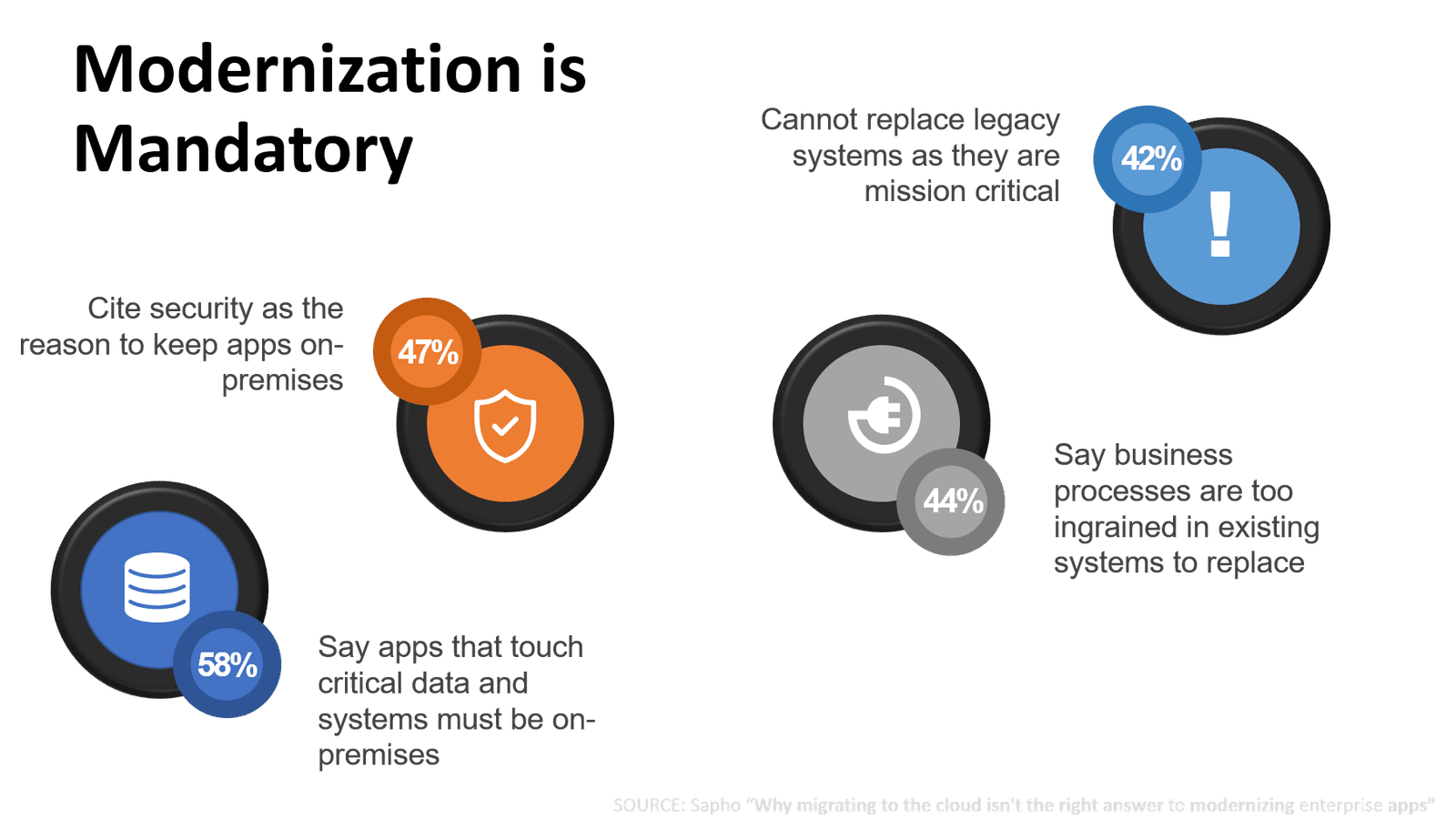 To see evidence of this in action, consider a Sapho study that explored reasons organizations weren't adopting cloud and were instead modernizing apps on-premises. In fact, over half (56%) said on-premises wasn't going anywhere and that less than 5% of their enterprise application portfolio would be making the migratory move to the cloud.