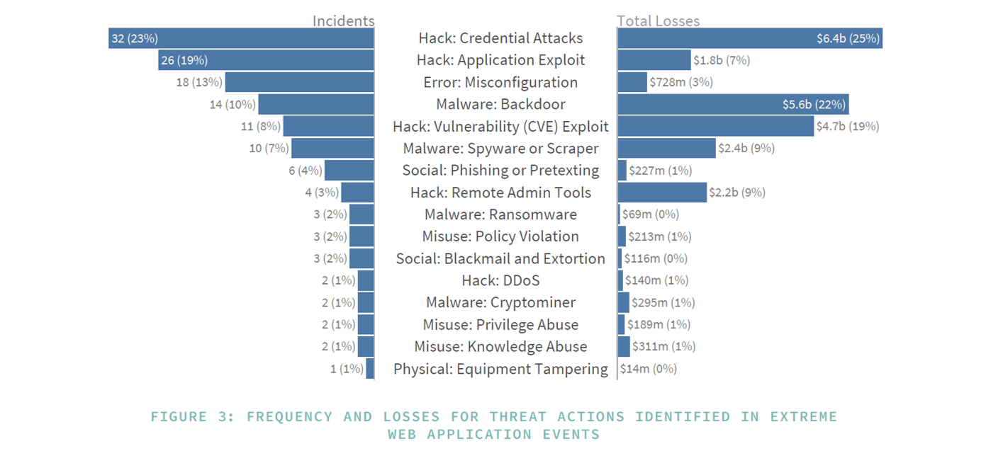 - 56% of the largest incidents of the last 5 years tie back to some form of web application security issue, constituting 42% of all financial losses recorded for these extreme events.