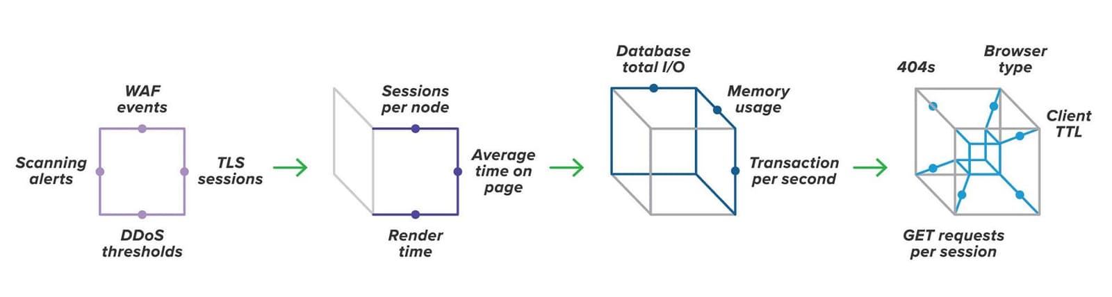 The first step is defining a data dimension. Choose the level of granularity best suited to the way the data will be used, and the individuals who will be using it—for example, you might provide more detailed security data for security professionals than for UX teams. Once multiple data dimensions have been defined, they can be combined in a single report or visualization that details the individual dimensions and provides a representation of the relationship between those dimensions—hence the term multidimensional visibility. With enough data dimensions, you can create an end-to-end, holistic view of your application.