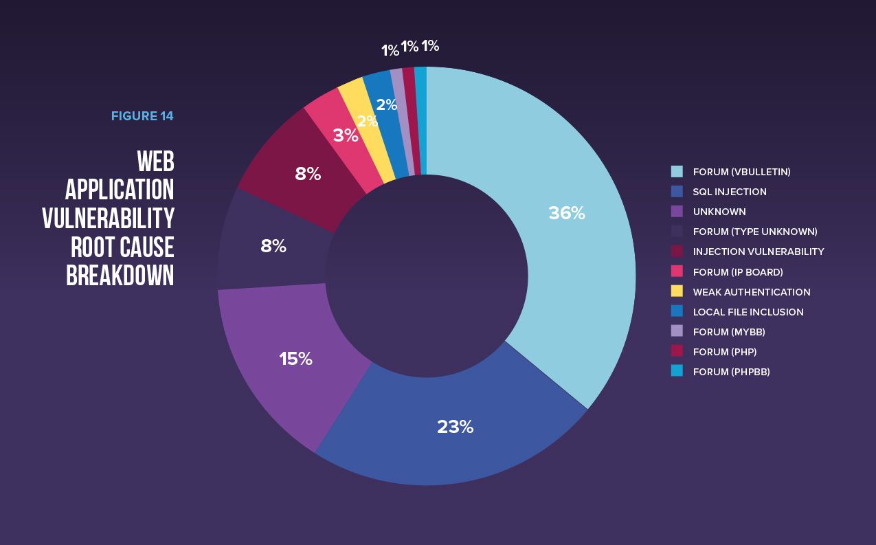 One-way attackers can get to data is by exploiting applications directly. In fact, applications were the initial target of attack in the majority of breaches at 53%. Those attacks exploited the systems by targeting web application vulnerabilities with primarily injection attacks against various types of forum software at the application services layer and SQL injection attacks.