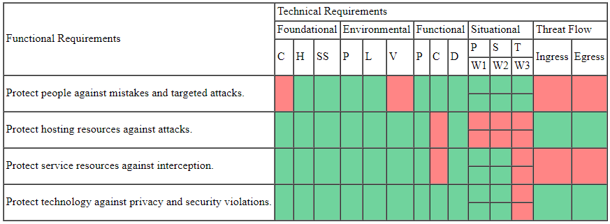 This view demonstrates how well prepared your organization is to meet the functional requirements. At the same time, it provides traceability to the various causation models derived from your organization’s business model. A more detailed traceability matrix might list the actual solutions used such as firewalls or antivirus. In the real world, expect to see more red because security is an incremental journey.
