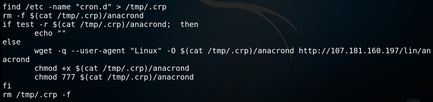 For additional persistency, another file named “anacrond” is downloaded, which is copied to every folder named “cron.d” under the /etc directory. It is also saved to /etc/cron.d/anacron, which is a system cron job file. The commands in the file are like the ones in “update.sh”—they download the deployment bash script and restart the mining process.