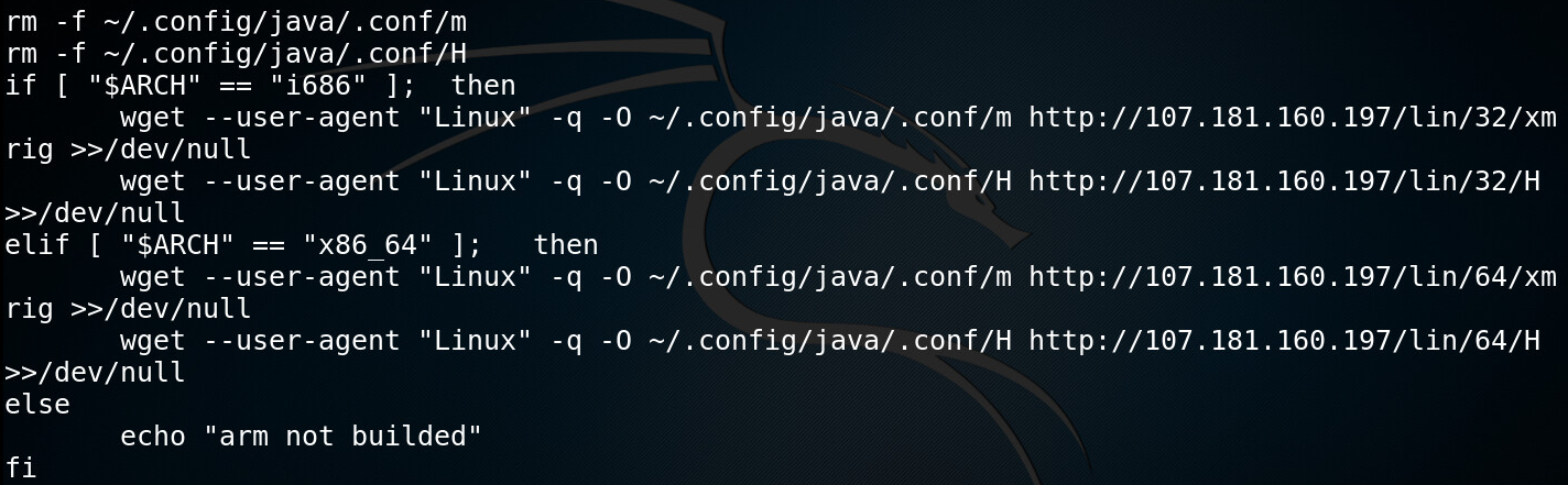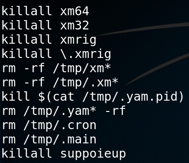 Any doubts about the intention of this malicious campaign is dispelled once the attacker tries to kill the processes and delete the binaries of previously installed crypto-miners. This is commonly done by crypto-mining operations these days.