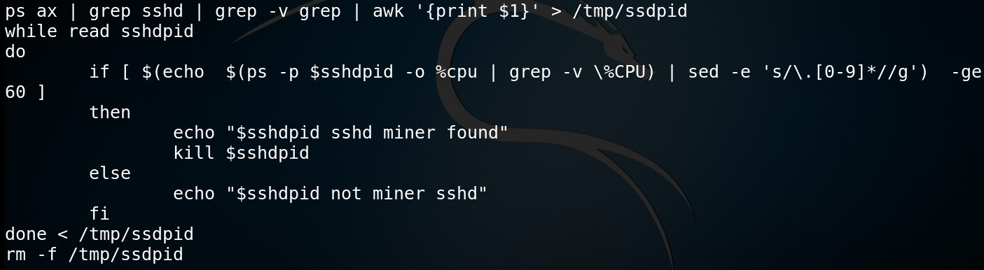 For some miners, the attacker decides to take a more careful approach and check each process name and process CPU usage and then kill only those processes that utilize 60 percent or more of the CPU resources. This is probably done to avoid killing legitimate processes as the names of these miners (crond, sshd and syslogs) typically relate to legitimate programs on a Linux system.