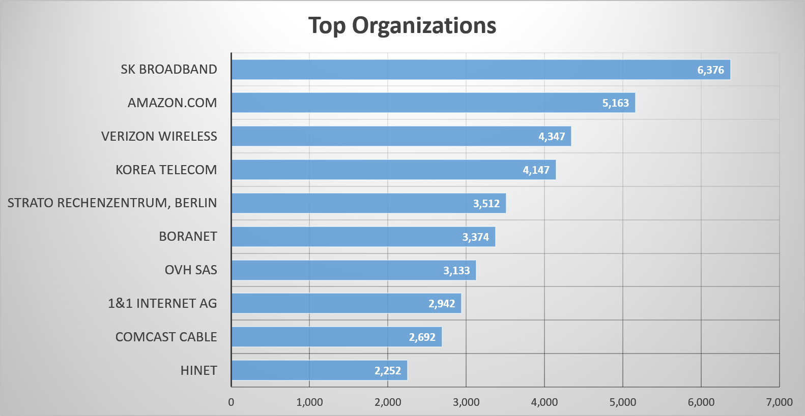 Figure 1: Top organizations in a Shodan search for CVE-2014-0160 on Jan 22, 2017