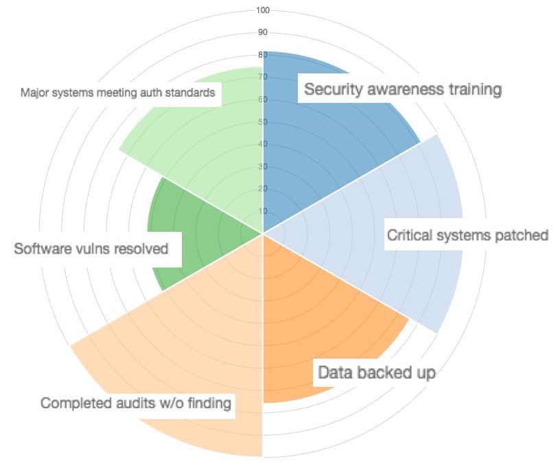 To do this, you simply prioritize and make things quantifiable. Prioritizing means you focus on the top cyber risks and providing just the information the board really needs to know. A good place to focus is on the state of company culture regarding security. How far off is it from where it needs to be and how can leadership recalibrate it. You’re not going to get a consensus of attention regarding security unless the message originates from the top. So, this is where you should start. And once it’s started, it’s something you can revisit with the audit committee or Board. You can produce metrics on alignment with things like numbers around security awareness training attendance, patching completeness, audit findings, counts of software defects related to security, incident counts, and backup coverage. You can even make a nice radar chart to show the percentages and quickly make the deficiencies apparent.