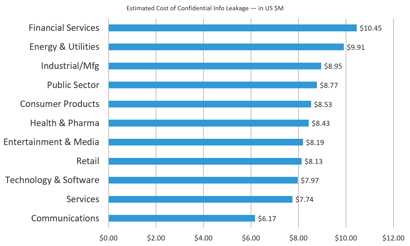 Our first question was about the cost of leakage of internal confidential information. The extrapolated average impact across all sectors was $9.08 million. Financial Services topped the list while Communications was at the bottom. Nothing too earthshattering in these results, but let’s keep going.