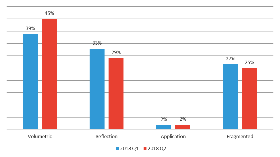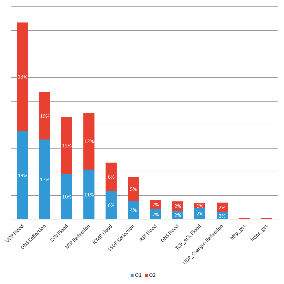 Figure 5: 2018 DDoS attacks mitigated by F5 SOC by type, Q1 and Q2 2018