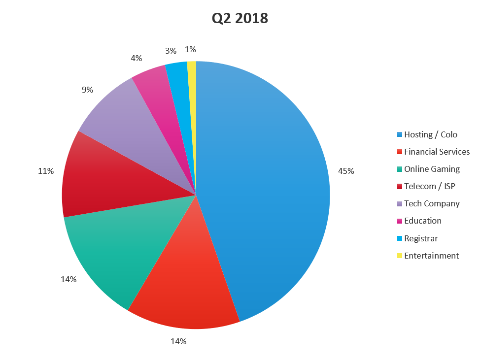 - Q2 was absent any excessively high volumetric attacks, yet the primary business verticals attacked were hosting and co-location service providers (typically large volumetric attacks are needed to impact these providers).
