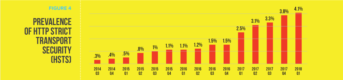 - The HTTP Strict Transport Security (HSTS) header, important because it instructs the browser to always use a secure connection, is finally seeing some forward motion, even though numbers are still very low. Since the summer of 2014, HSTS usage has grown from a mere .33% to just over 4% in Q1 of 2018.