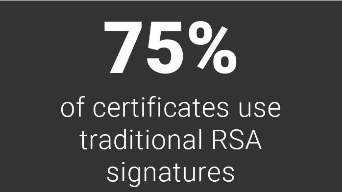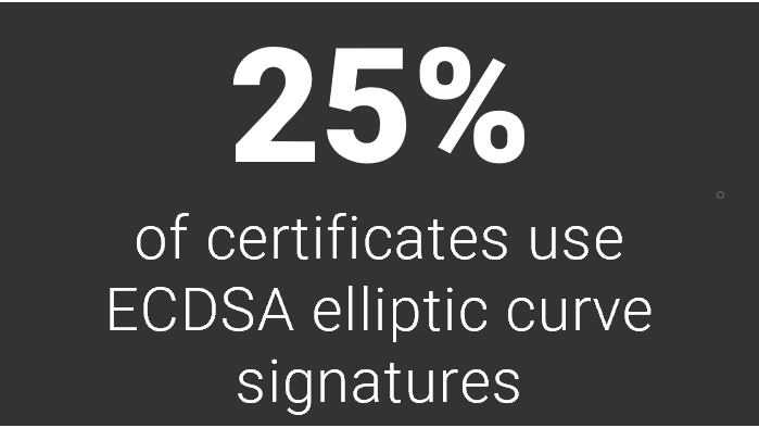 - The move to elliptic curve cryptography is slow but steady, with 25 percent of certificates now signed with the Elliptic Curve Digital Signature Algorithm (ECDSA) and over 99 percent of servers choosing non-RSA handshakes when possible.