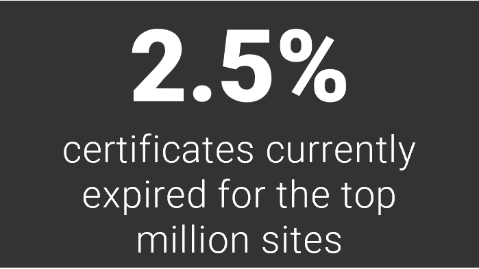 Overall, we found that 2.5% (or about 1 in 40) of the certificates in the full set of sites were expired at the time of scan.
