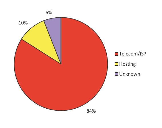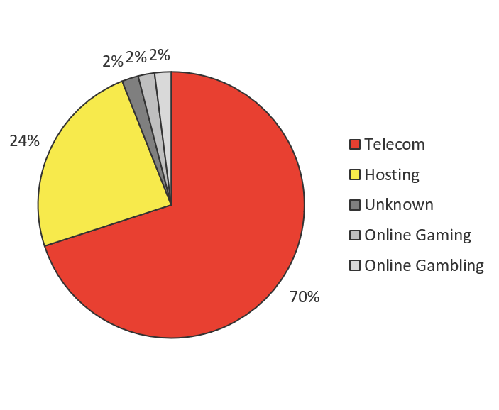 The majority of attacks come from Telecom and ISP companies that provide Internet service to homes, small offices and building networks in which the majority of IoT devices reside. Once an IoT device is infected, it is used to scan for other IoT devices to infect—a distributed scanning model most thingbots adopt—and is also used to attack. Because of this, we expect to see Telecom/ISPs generate the majority of IoT attack traffic, and this has been consistently true for the past two and half years.