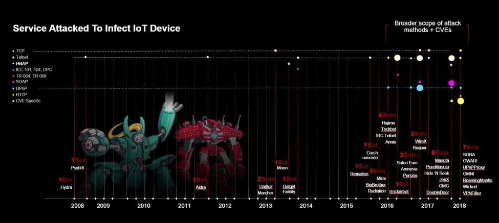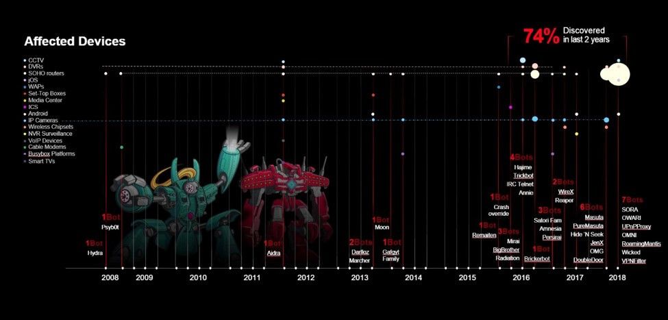 Figure 2: Discovery of thingbots over the past 10 years by the type of IoT devices they infect