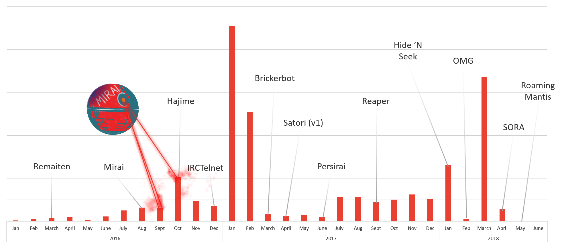 Since the Mirai source code became public, it has been forked at least 10 times in the form of Annie, Satori/Okiru, Persirai, Masuta, Pure Masuta, OMG, SORA, OWARI, Omni, and Wicked. Not only is the threat of the original bot still imminent, but there are at least 10 Mirai stepbrothers and stepsisters to worry about that do more than just launch DDoS attacks. Mirai stepsiblings also deploy proxy servers, mine crypto-currency, install other bots, and are available for rent.