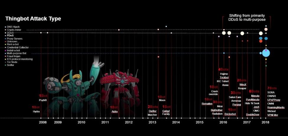 Building multi-purpose attack bots from “things” is popular in the attacker community now. Script kiddies are learning to build bots from YouTube videos and launching damaging DDoS attacks. Seventy-four percent of the thingbots we know about were developed in the last two years. Thirteen thingbots have been discovered in 2018 alone, and they are no longer single- or dual-purpose bots. There has been a shift to multi-purpose attack bots for hire that deploy proxy servers. You can launch any attack of your choice or install other bots using multiple attack options.