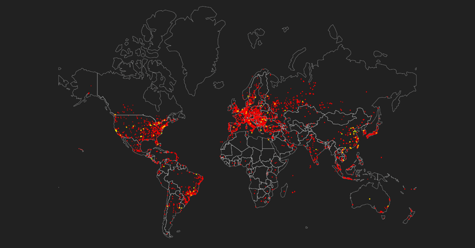 Each dot on the map in Figure 16 represents the latitude and longitude coordinates of a Mirai-infected device. The red dots represent “scanner” nodes that search for other vulnerable IoT devices in which to infect and grow the bot. The yellow dots represent the “malware” hosting systems where the latest updates can be fetched.