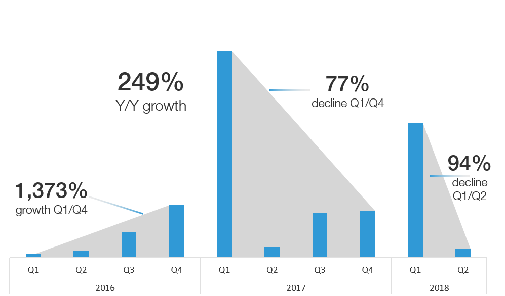 There was a large spike in attack traffic in March 2018 that drove a 94% decline in total attack volume from Q1 2018 to Q2 1018. We are still seeing more attacks against Telnet than when we started this research series in January 2016 but, as we have stated in the last two reports, we expect telnet attacks to trail off as IoT devices move to SSH for remote authentication.