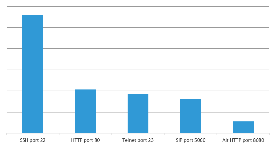 The chart in Figure 6 compares the top five attacked services: SSH port 22, HTTP port 80, Telnet port 23, SIP port 5060, and the alternate HTTP port 8080. SSH is attacked 2.7 times more often than HTTP. Telnet and SIP are attacked at close to the same rate at HTTP. The fifth most attacked port, 8080, is an alternate HTTP port that is commonly used by SOHO routers, smart sprinklers, and Industrial Control Systems (ICS).