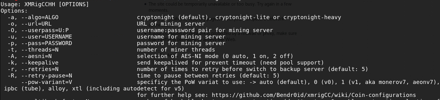 The “xmrig” file is a miner with an embedded configuration (pool, username, password etc.). This is not the original XMRig miner, but rather a fork of it named XMRigCC,6 built for CPU mining optimization.