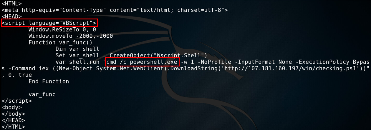 An additional file on the server at /win/checking-test.hta holds a Visual Basic script that calls a Microsoft Windows cmd to run a Powershell command on a targeted victim. So, it seems this threat actor is targeting Windows OS (not just Linux) using another operation hosted on the same server.
