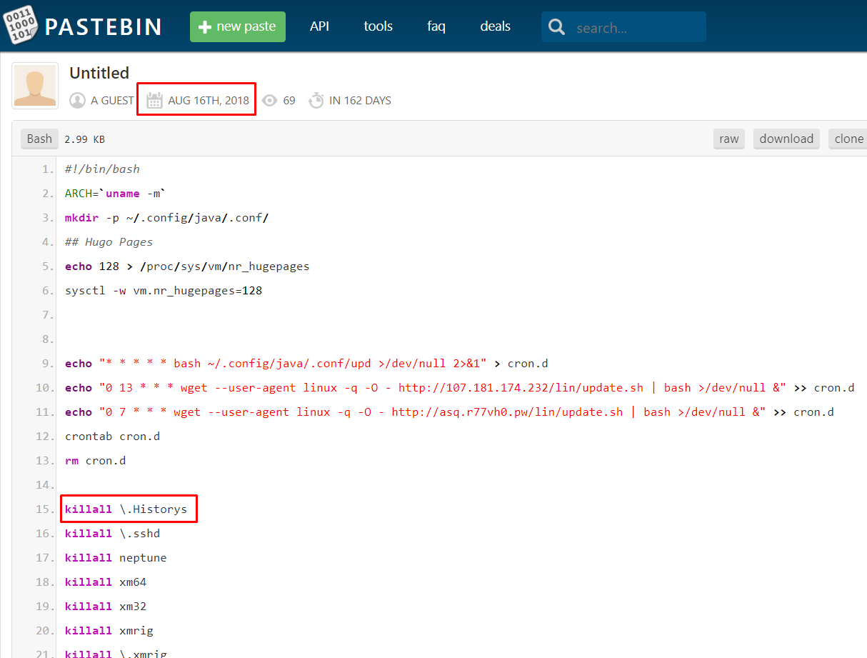 We have spotted a draft of “update.sh” on https://pastebin.com/jRerGP1u with some differences from the currently downloaded malicious script. The script was uploaded on Aug. 16, 2018.