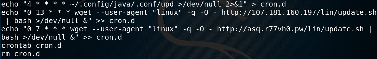 Three cron jobs are set in place for malware persistency. Two of them download and execute a new update.sh file every day. Interestingly, the files are downloaded both by using the explicit server’s IP address or its domain name. During the download, it uses a special “linux” user-agent (in some cases “Linux” with upper case L) as an access restriction mechanism, while IP accessing with any other user-agent is banned.