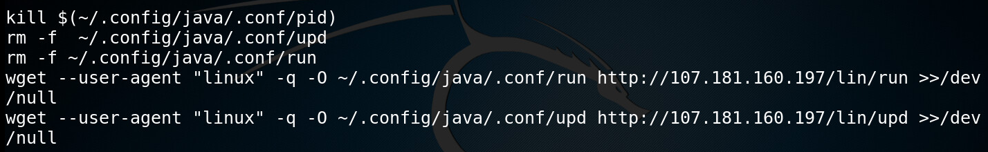 Once the competition is knocked out, the attacker removes the older version of his own malware files and downloads the freshest versions of the “run” and “upd” bash scripts.