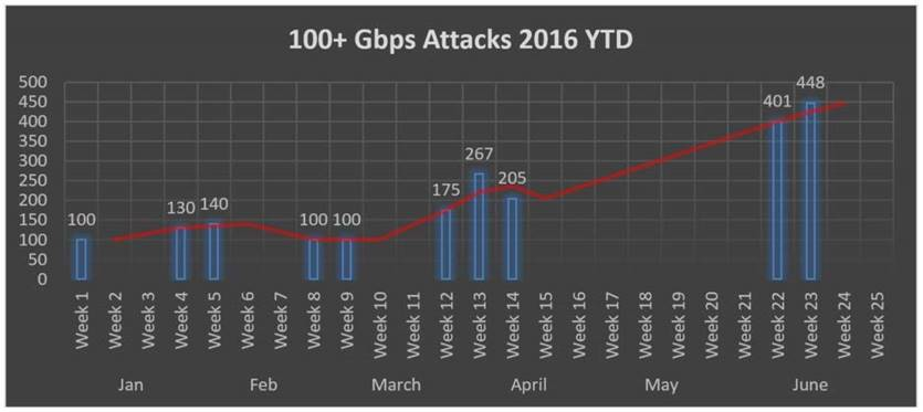 Figure 1: Peak attack bandwidth in Gbps, 2016 YTD