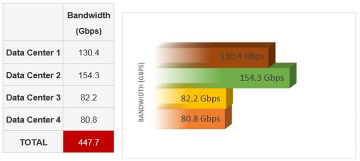 Below is the breakdown of attack traffic per data center, peaking at a total of 447.7 Gbps.