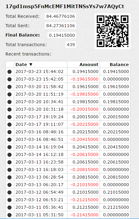 This particular account has processed 84 bitcoins, which translates to roughly $86,000 USD at current market value (bitcoin value fluctuates slightly day to day). Since the Struts exploit has become publicly available, we observed 2.2 bitcoins going in and out of this wallet, worth roughly $2,300 USD.
