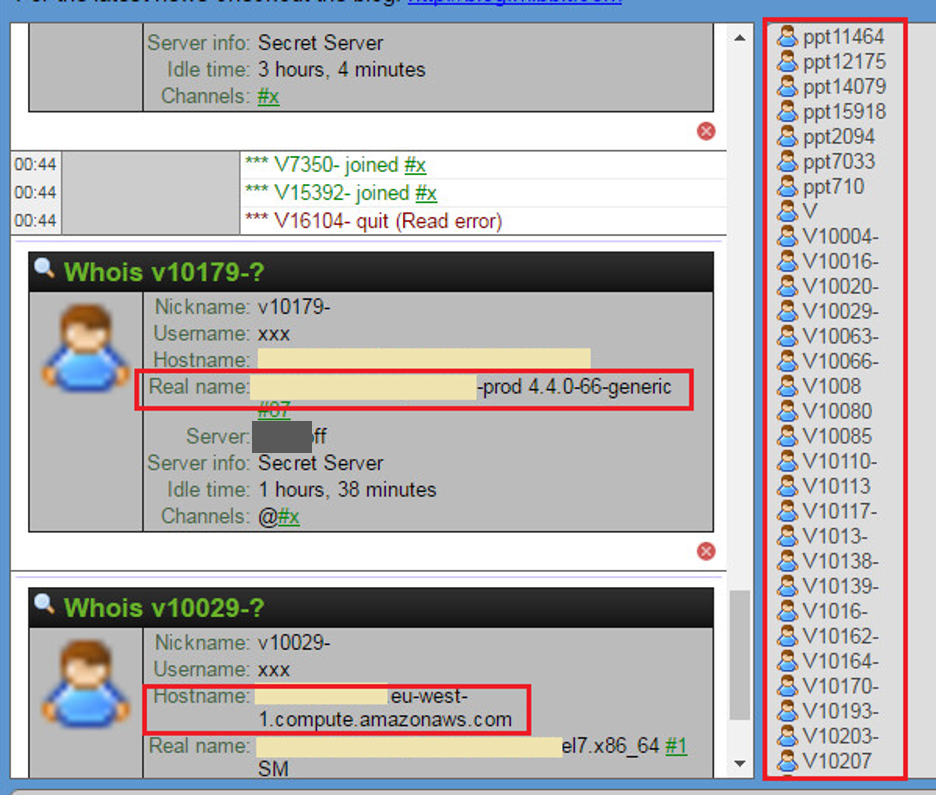 By randomly exploring some of the names and IP addresses of the infected hosts connected to the channel, we could find production servers and servers hosted on the AWS infrastructure.