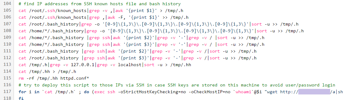 One of the more fascinating aspects of this malware was the creative technique that the spearhead exploit uses to propagate itself. It will search for all the remote IP addresses that the administrator of the server was connecting to on this server. It searches the SSH “known_hosts” file, which keeps the IP addresses and fingerprints of all the servers to which the administrator was connecting. It also scans the Bash history file for any IP addresses used within the SSH command. Once this list of IP addresses is compiled, the script tries to connect to them via SSH. If the configured authentication was set up to use a key file instead of a username and password, the malware will successfully deploy itself on the remote machine.