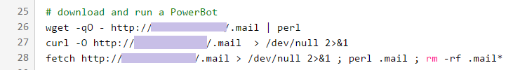 In the first days of this campaign, shell commands were observed to infect the machine with the “PowerBot” malware, which is written in PERL, and uses DDoS as its main functionality (also known as the PerlBot or Shellbot).