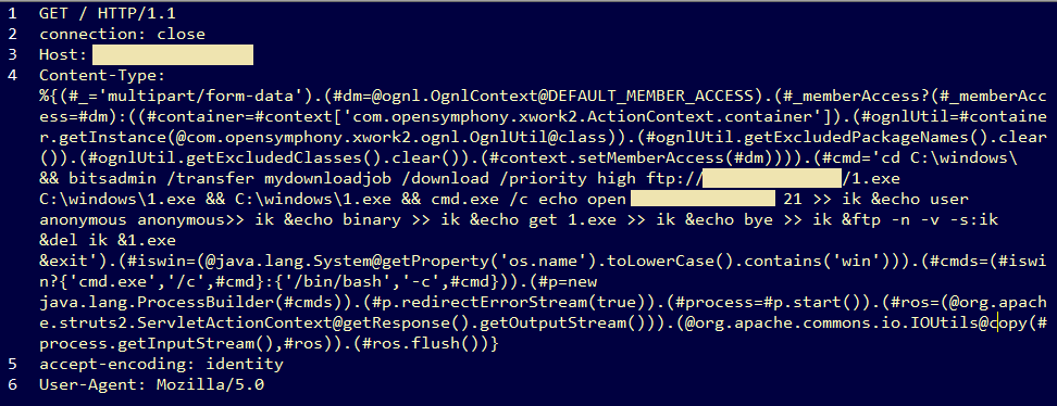 The structure of the Jakarta Multipart parser exploit is identical to the attack that was used to deliver previous payloads. However, the current executed shell commands run the Windows BITSAdmin and ftp command line tools (which ship with every Windows server) to download and run the file “1.exe”, as shown in Figure 13.