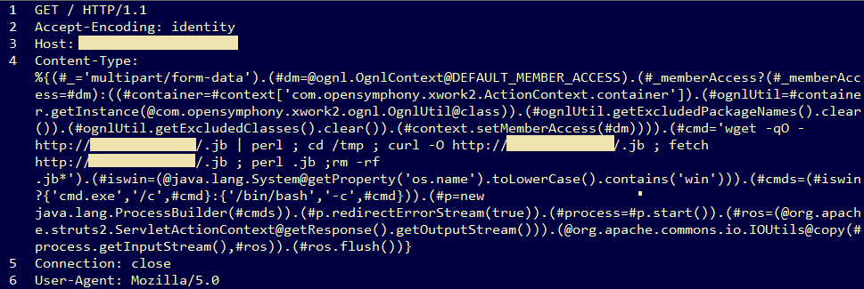 This campaign started on the 10th of March, 2017 a couple of days after the vulnerability was disclosed. While it looked similar to the other CVE-2017-5638 campaigns, the attack vector seemed to be a slight modification of the original public exploit2.
