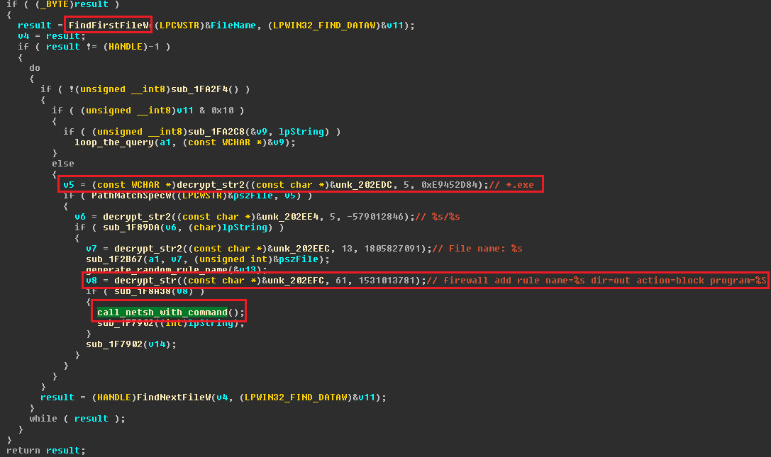 Then it traverses through files and folders resulted from the query, and adds them to a firewall rule if they are executables.