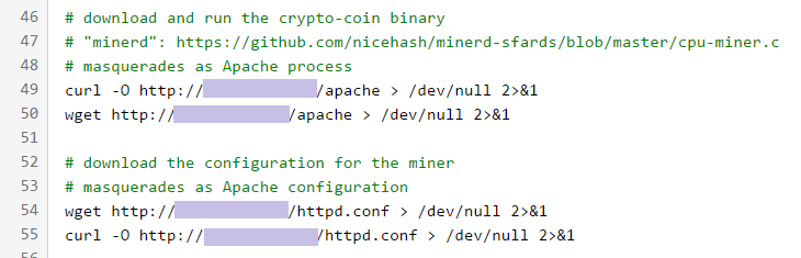 However, this time, a “minerd” crypto coin mining program will be downloaded as well with all of its prerequisites. The attacker masquerades the malicious process and its configuration with names similar to Apache server, to make it look more innocent when the infected user will list all the running processes.