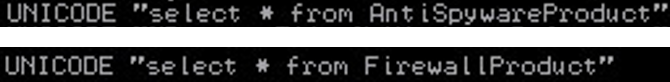 To find the installed security products, the malware first runs WMI queries on the “AntiSpywareProduct” and “FirewallProduct” classes.