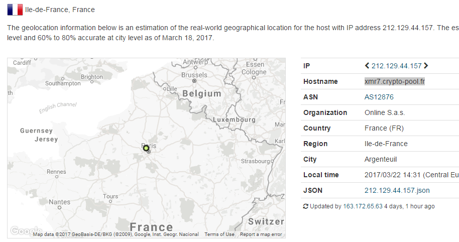 These cryptocoin pools appear to be hosted in France under the “crypto-pool.fr” domain name, as shown in Figure 7.