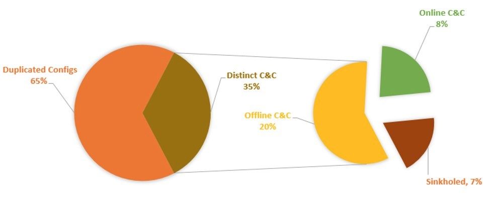 F5 research conducted in March 2017 followed 153 Marcher configuration files to uncover target and activity trends in the worldwide attack campaigns. Among the 153 configuration files, 54 distinct command and control (C&C) servers were detected. Of the 54 distinct C&C servers, 12 of them were online and operational (until F5 had them shut down in March), 10 were sink-holed, and 32 were already offline. The remaining 99 C&C servers were duplicated configurations from different APKs. This is likely due to configuration files being hardcoded within the APK, and old spam campaigns infecting different users, thus, old configurations still being detected in the wild.