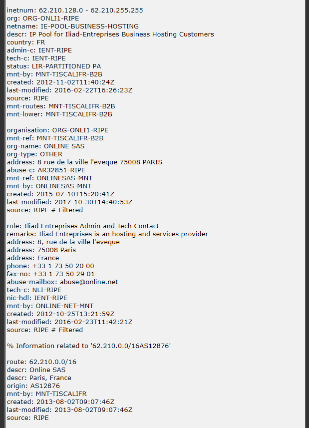 | 62.210.152.47 | NYU | ONLINE S.A.S. | ASN12876 | France | Hosting |