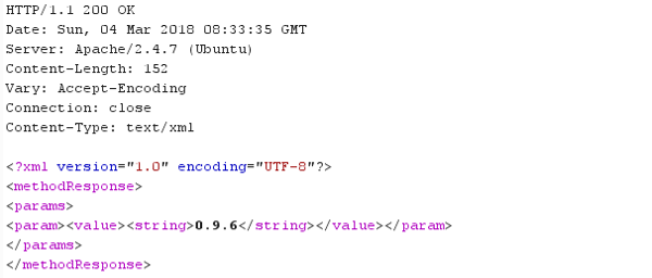 The HTTP POST request targets rTorrent’s XML-RPC interface and tries to invoke a “system.client_version” method on the frequently used path “/RPC2”. Upon successful execution of this method, it returns the rTorrent version number as shown in Figure 2.