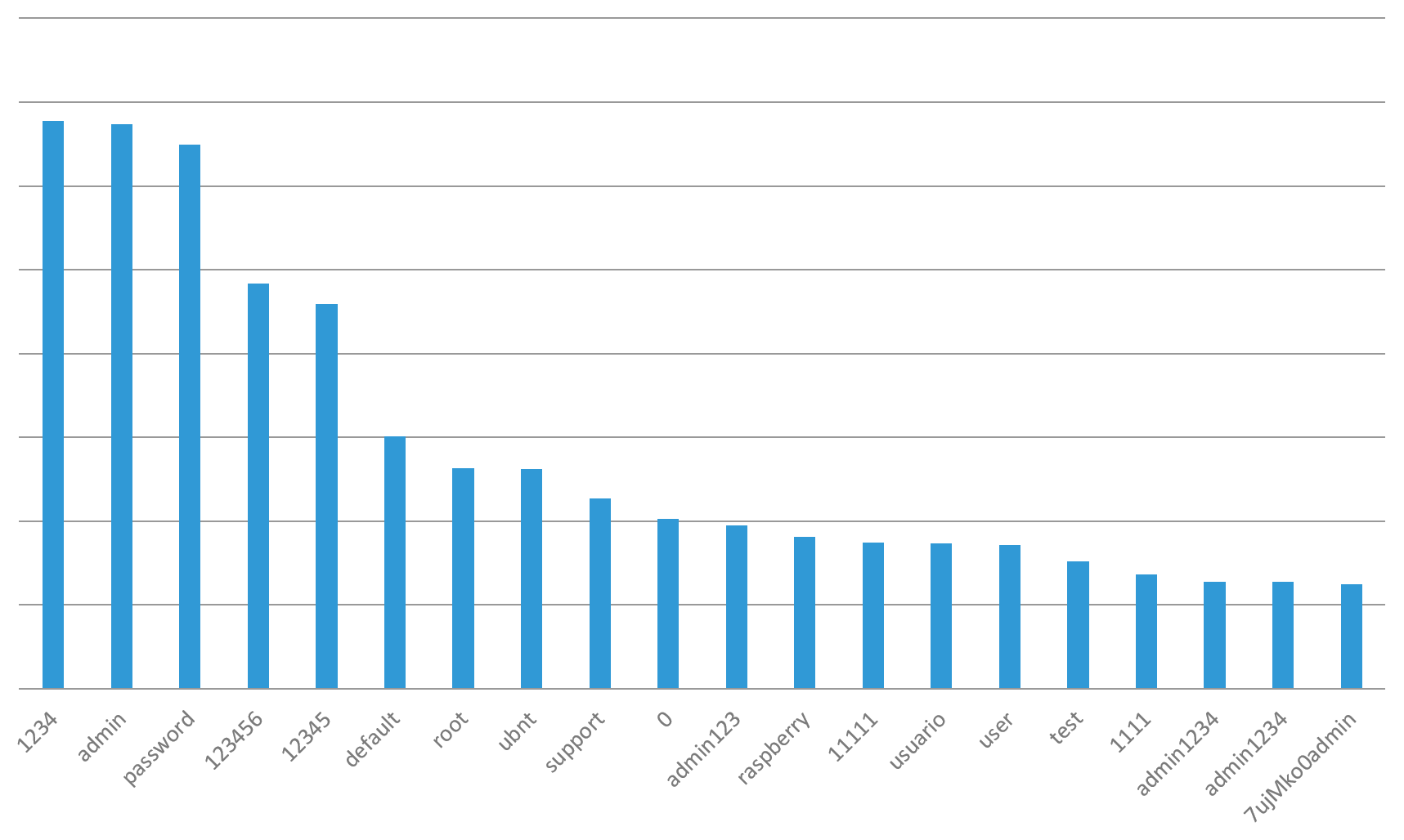 For the top 100 list of attacked user names and passwords, see the Hunt for IoT v5 Report (/content/f5-labs-v2/en/labs/articles/threat-intelligence/the-hunt-for-iot--multi-purpose-attack-thingbots-threaten-intern.html) on F5Labs.
