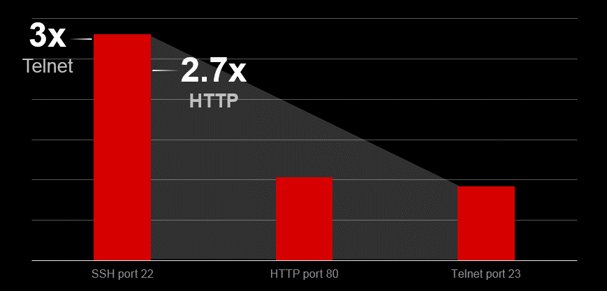 By attack volume, attackers focus more time and effort attacking SSH (/content/f5-labs-v2/en/labs/articles/threat-intelligence/the-hunt-for-iot--multi-purpose-attack-thingbots-threaten-intern.html) than any other online service. Brute forcing access to administrative logins of production applications over SSH occurs 2.7 times more than attacks against the application itself over HTTP (attackers trying to exploit web application vulnerabilities).