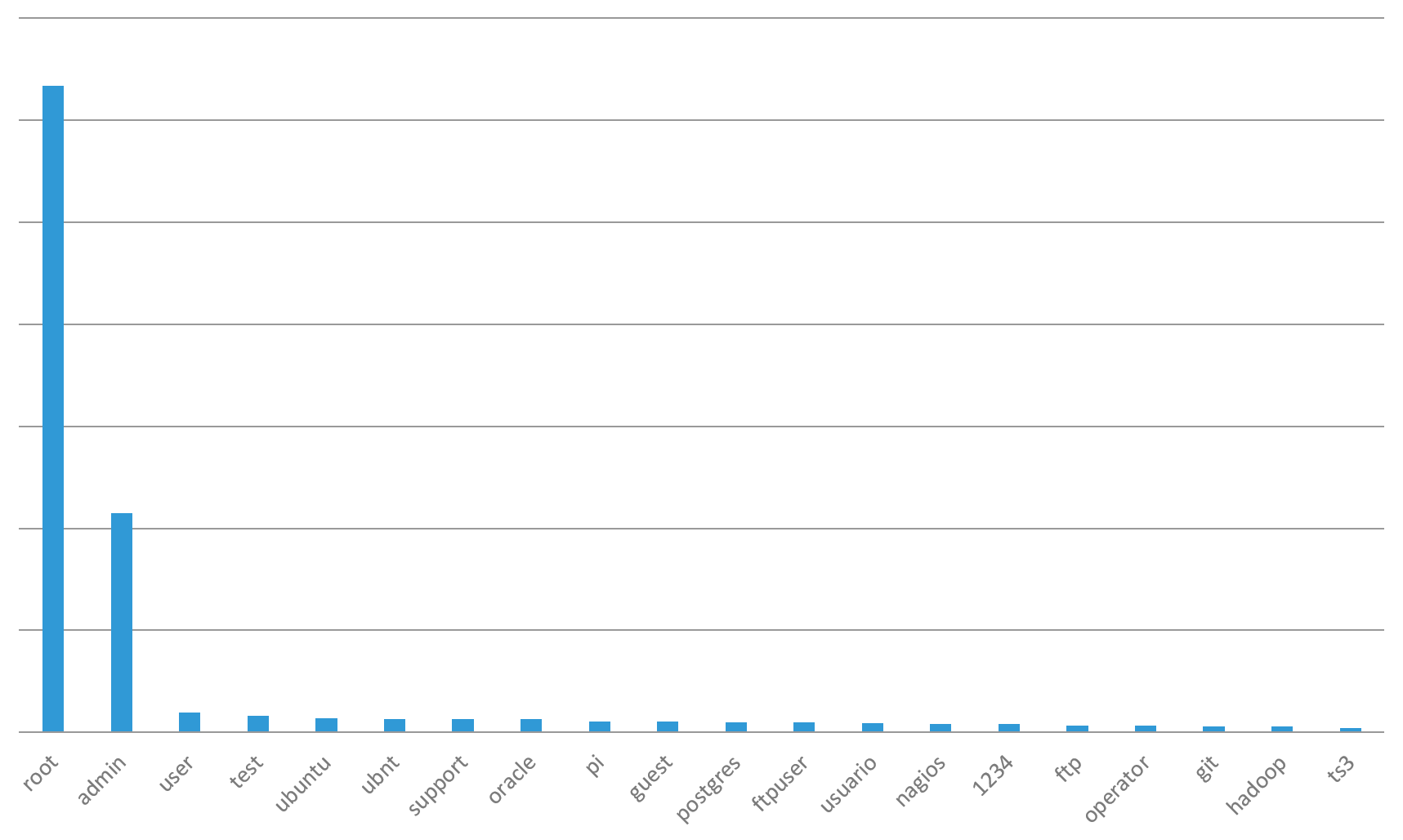The most attacked SSH username is “root” - the most common vendor default credential created for administrative access to Unix-based systems (commonly network devices, applications and IoT devices). It is so common for this default user to not be disabled (or password changed), that it is attacked 3 times more than the username “admin,” in the second most attacked position.