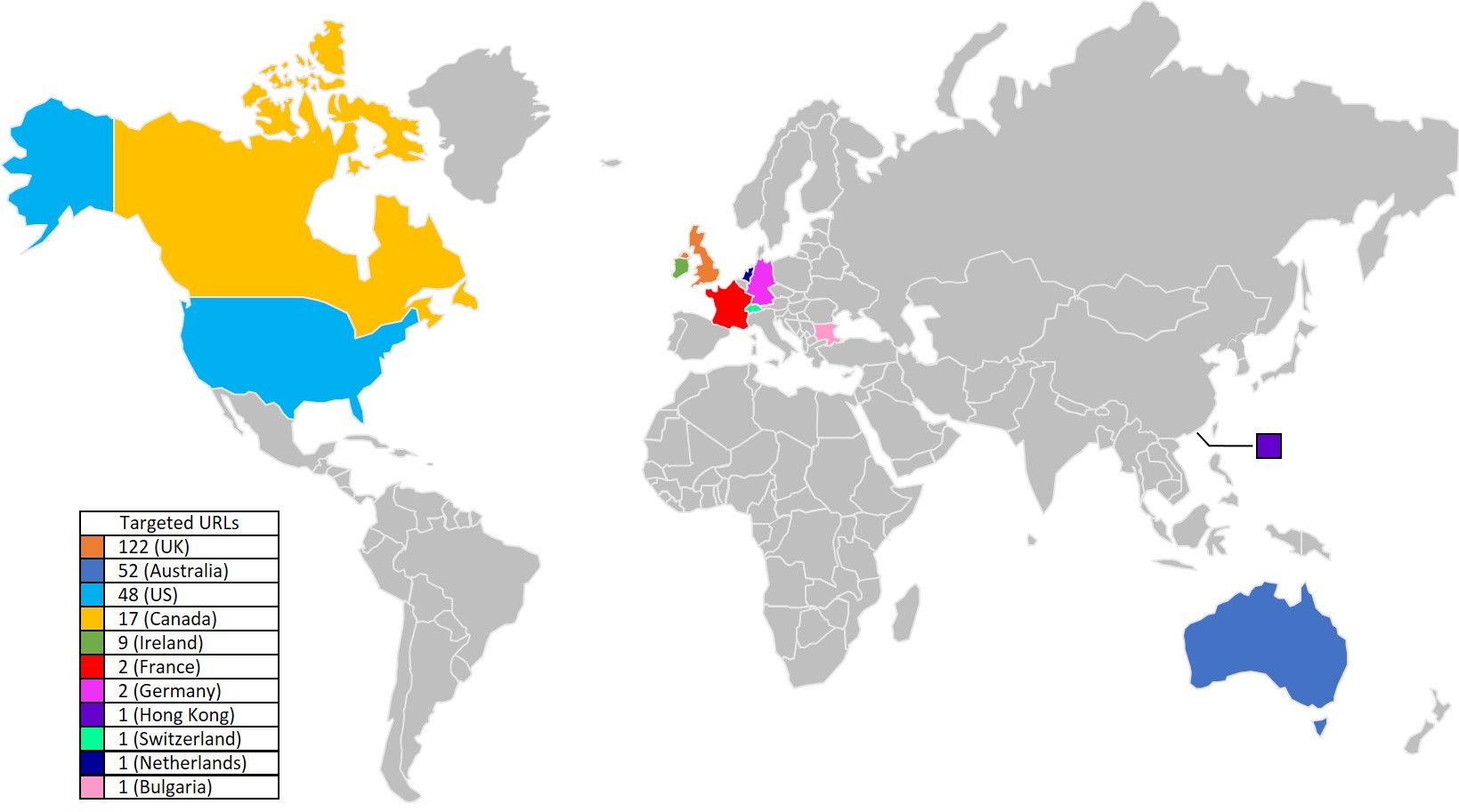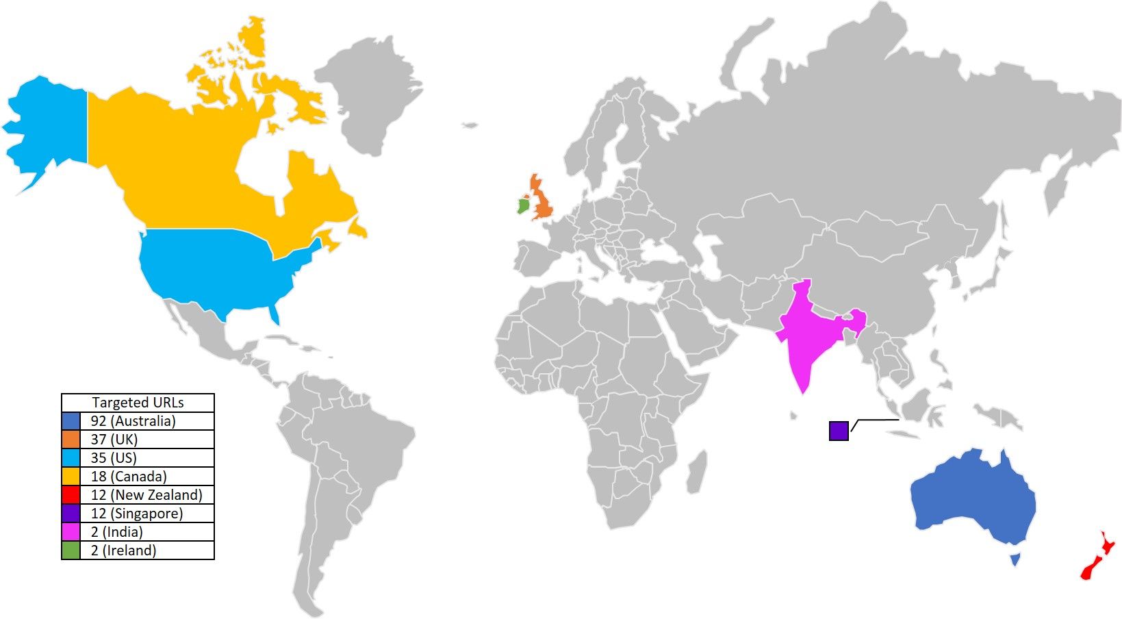 The smaller campaign focused on targeting banks (83% of URL targets) in Australia, UK, Canada, New Zealand and Singapore, and a payment processor (PayPal) attributed to the US (although PayPal users are global).