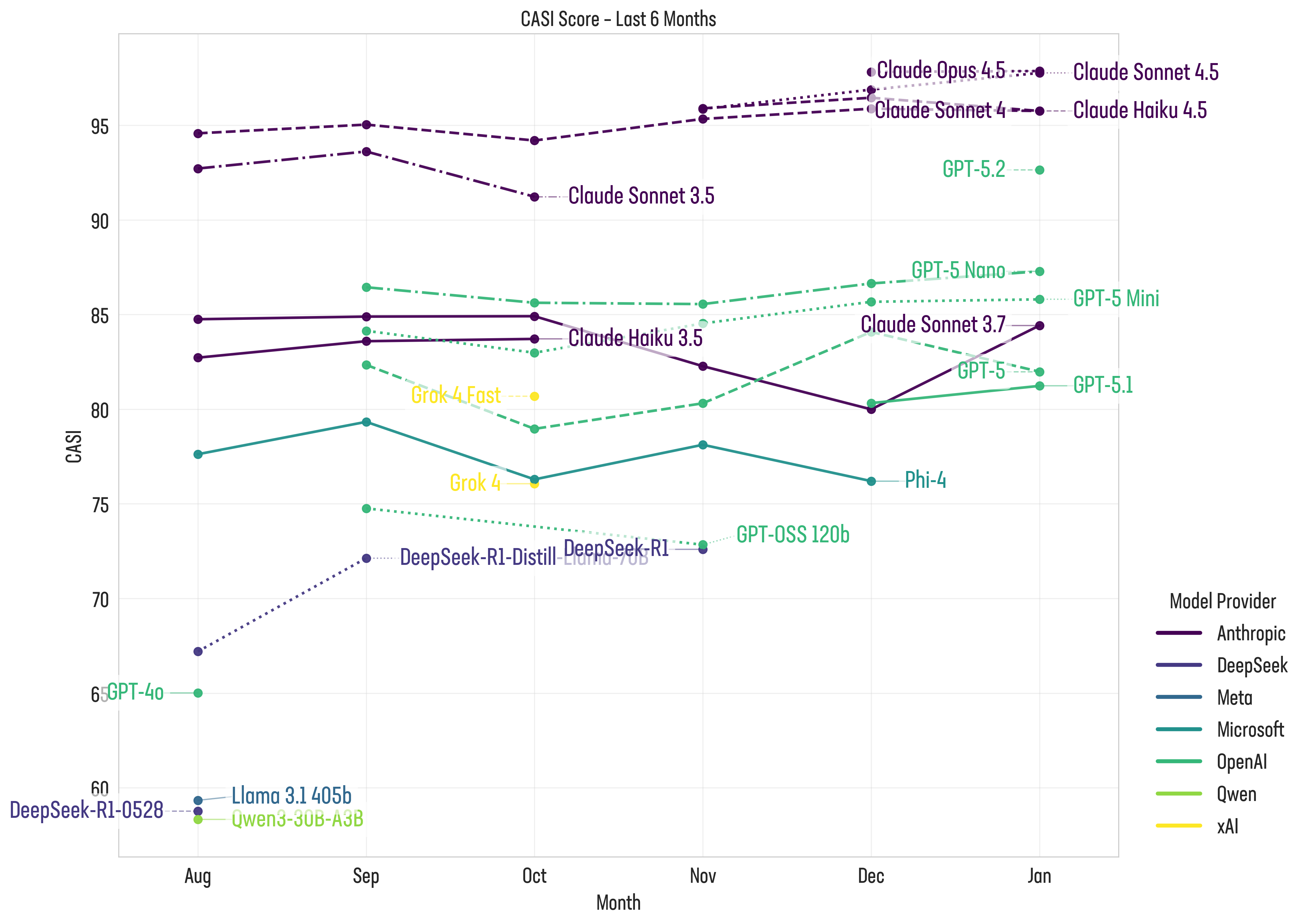 Figure 1: F5 Labs CASI Leaderboard for the top ten scoring LLMs (only) over the past 6 months