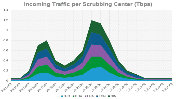 After this attack was successfully mitigated, F5 Silverline applied additional countermeasures further upstream within F5 Silverline's globally distributed IP Anycast network using BGP Flowspec.